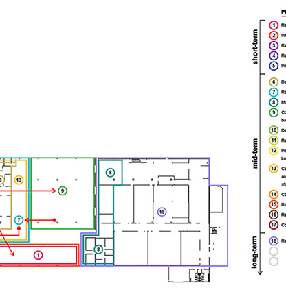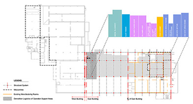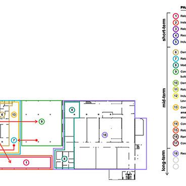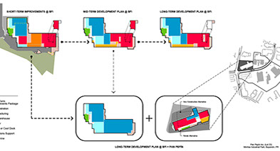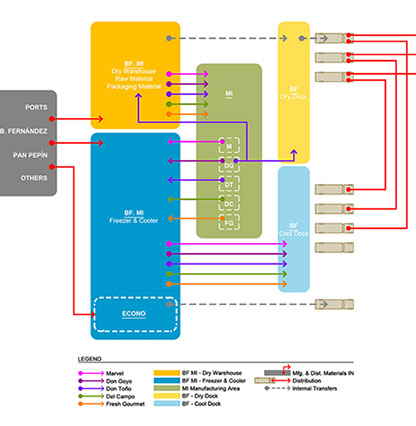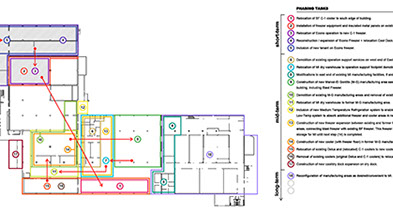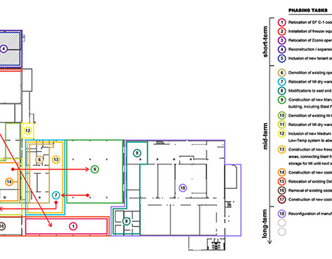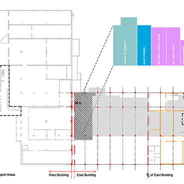 This 30’ high distribution warehouse was added a series of refrigerated units and a manufacturing facility approximately 10-15 years ago. archUD was commissioned to study existing conditions, growth and operational efficiencies obtained through spatial improvements and reconfiguration of existing program components to optimize distribution and manufacturing operations. Recommendations arising out of the report are under implementation as of early 2021.